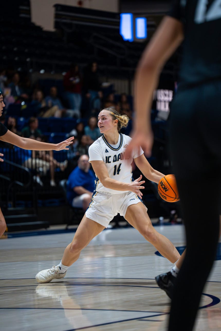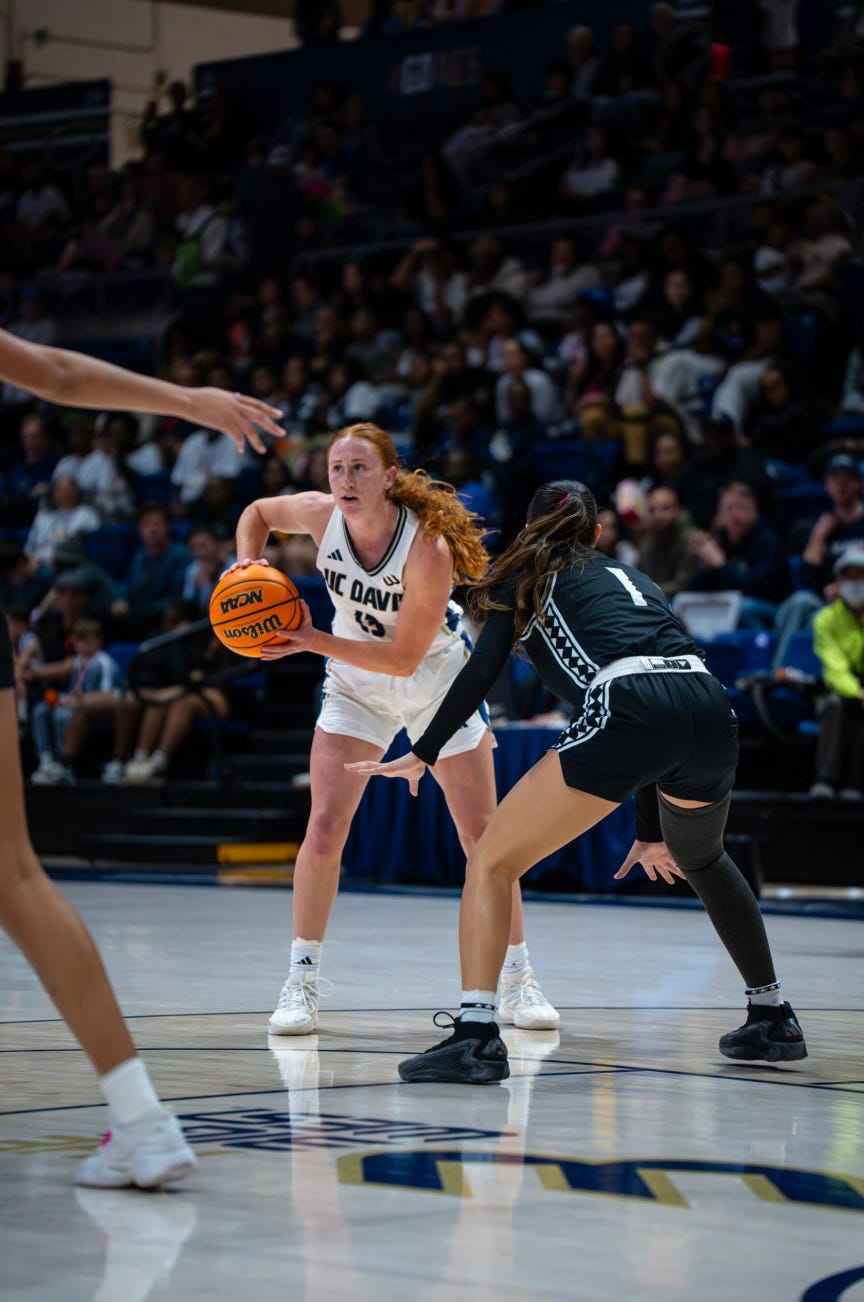 Each and every season there are games when a team displays its true character. We saw it from the Aggies on Saturday in one of the most exciting and joyous games I have seen in my 14 years following UC Davis Women’s basketball. It started on the perfect note with a brilliant performance of the Star Spangled Banner by January Karbowski, age 11. Had he been at courtside, Francis Scott Key would have remarked, “Now that’s what I’m talking about!” One important addition: the incredible Victoria Baker was also one of the pre-game honorees. Vic has been adding spark to this team for three years.