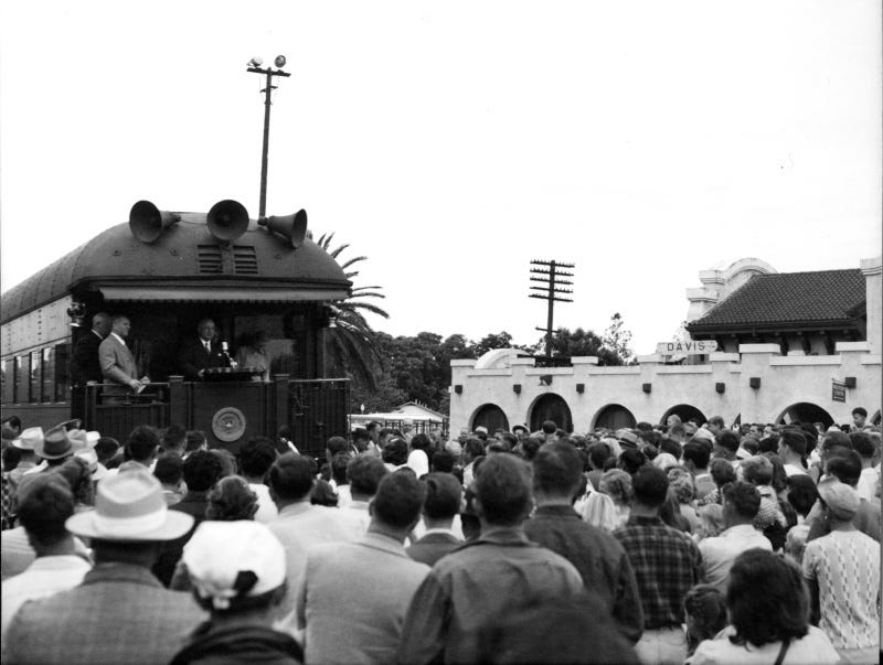 51. True or False: President Harry Truman brought his whistlestop campaign to the Davis train station.